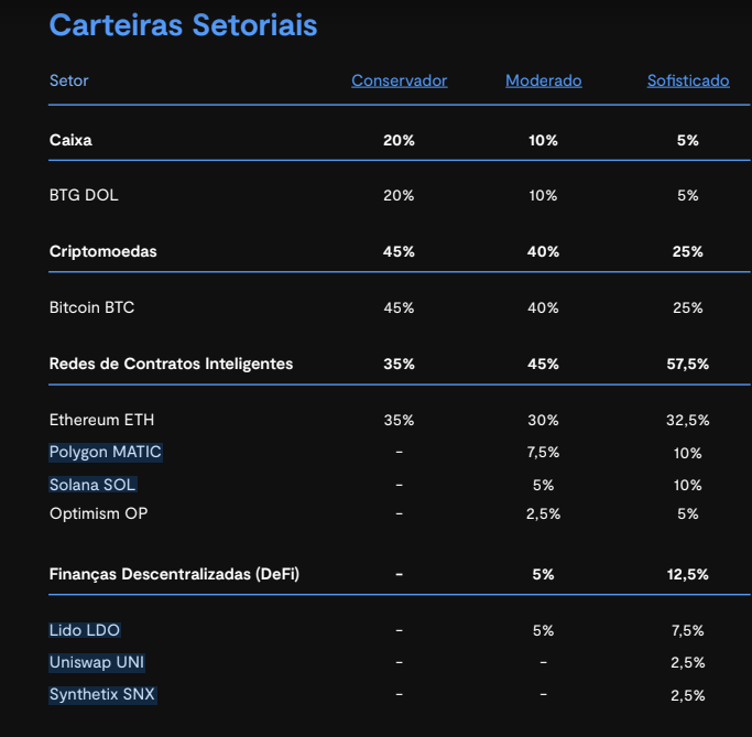 No entanto, para cada uma destas criptomoedas o BTG indica uma porcentagem de alocação conforme o perfil de cada usuário.