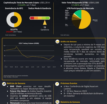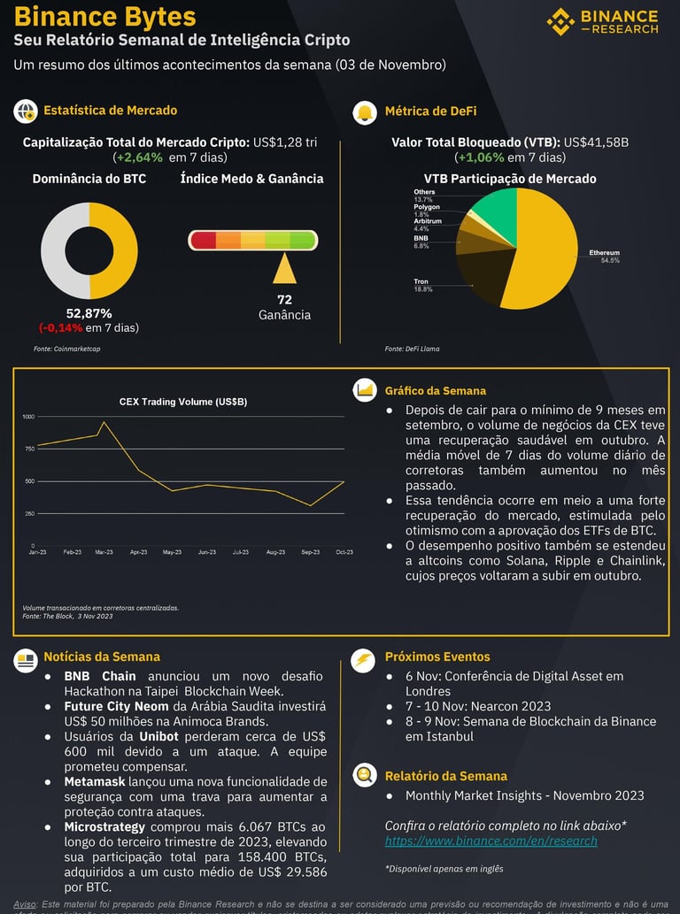 O Índice de Medo e Ganância está atualmente em 72, indicando um sentimento de euforia e um maior apetite ao risco por parte dos investidores. Além disso, o volume de negociação também refletiu esse sentimento, atingindo US$ 498 bilhões em outubro, o maior desde abril de 2023.